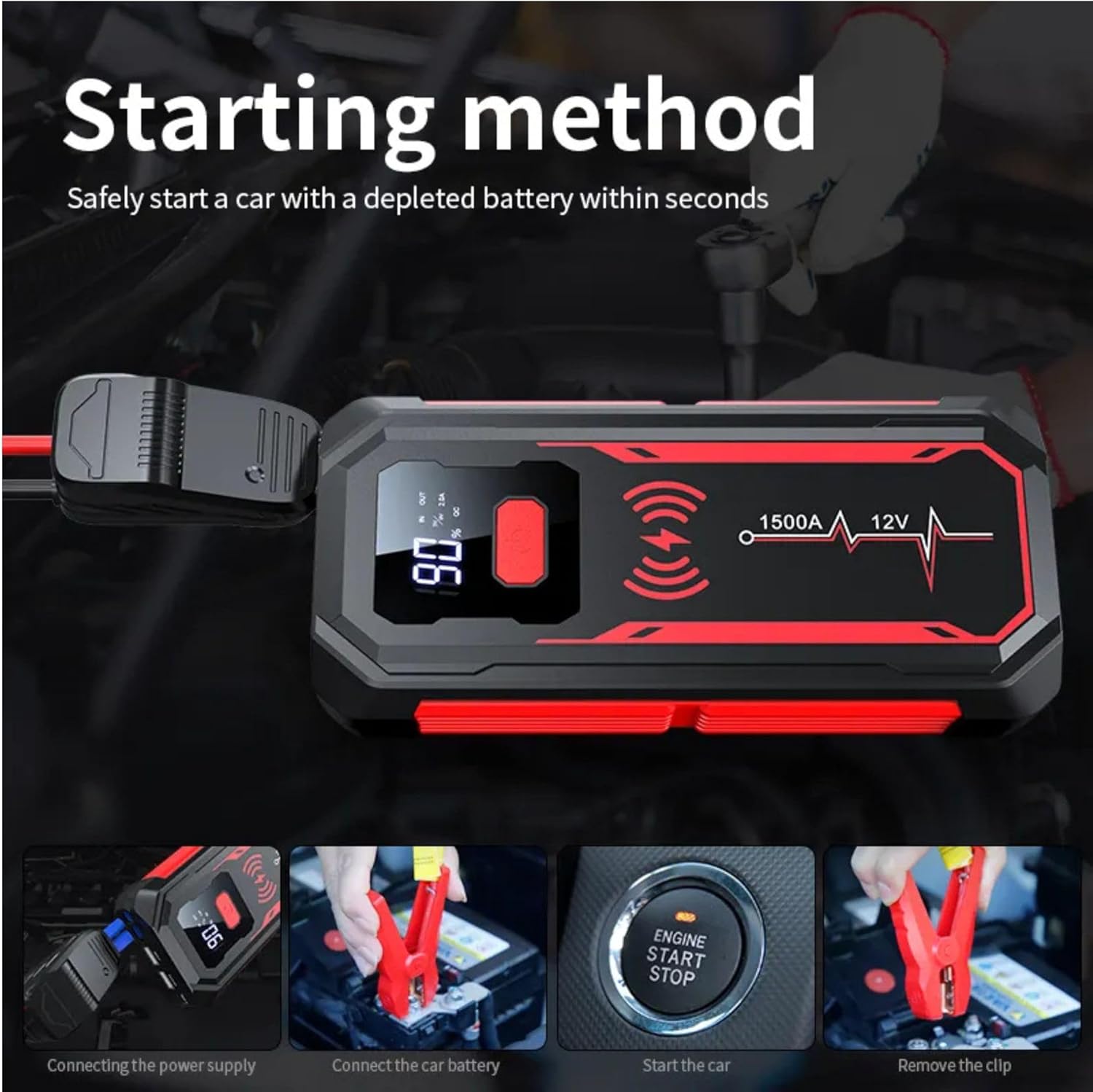 With its powerful 1000A peak, versatile features, and compact design, this portable car jump starter is your ultimate solution for handling dead batteries and keeping your devices charged on the go. Be prepared for anything with this 3-in-1 car jump starter, power bank, and LED flashlight, perfect for both daily drivers and outdoor enthusiasts alike.